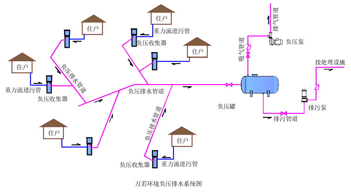 负压排水可实现高浓度污水的密闭收集与排放,可以实现“水往高处流”的目的。