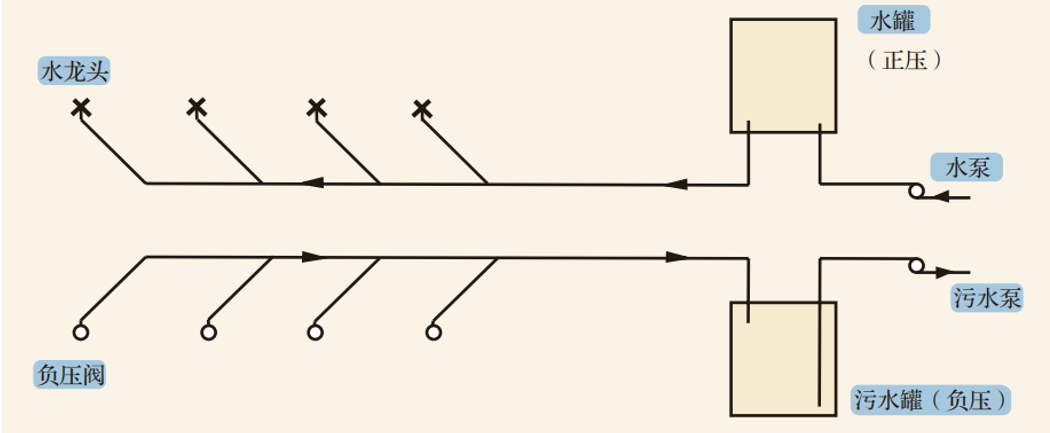 负压排水管网与自来水供水管网在系统结构、管网铺设、运行上很相似,只是介质的流动方向相反。